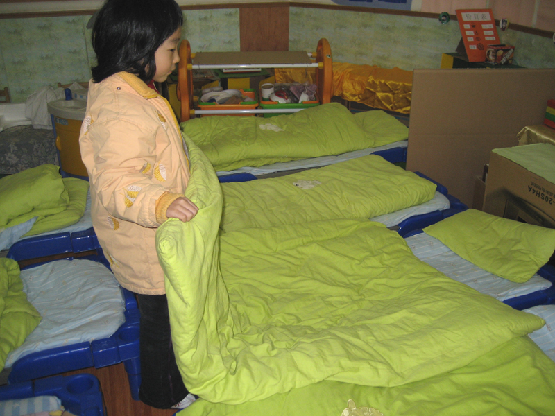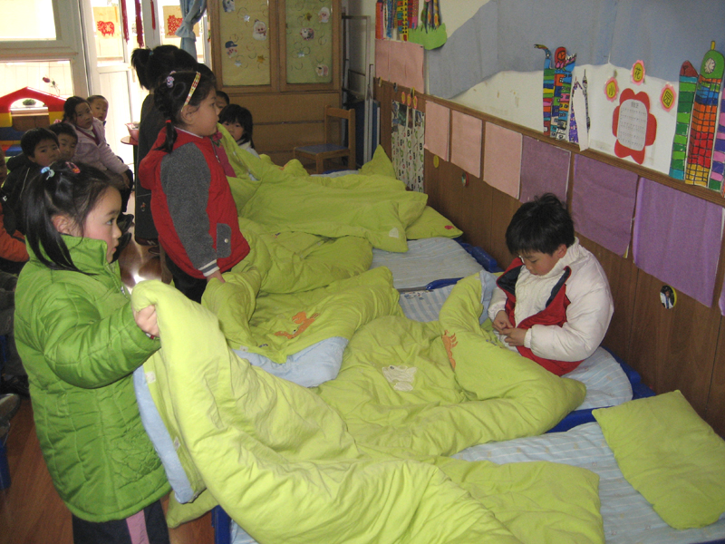 | 新的课程指南中指出:幼儿园的生活活动主要是积累文明生活的经验,体验健康安全生活的重要。大班的孩子已有了一套熟练的自我服务本领,但如何让这些孩子能深入生活,感受生活中的健康与安全呢,这就需要我们教师进行适时捕捉和引导的,而最近发生的一件小事让我感悟到这些理论的重要性。 随着午睡音乐的响起,孩子们赶紧穿好衣裤,然后把被子折叠整齐,这一系列的操作看似很流畅,但在其中隐藏着一个很大的“卫生问题”:因为进入大班后的孩子,最着年龄的增大和活动量增加,新陈代谢不断旺盛,因此午睡时经常能闻到脚臭和从被子里散发出的一股味道,而老师则越发要重视孩子们生活中的卫生问题。因此,每天让孩子在起床后翻过被子,让被子“呼吸”一下新鲜空气,也不妨是缓解这个问题的好办法。 有了这种想法,我们班再经过一番尝试后,有了新的调整:起床后先穿衣服,然后把被子翻个面透透气,再穿裤子,鞋子,最后折叠被子。这样,既统筹安排了时间,又培养了孩子良好的生活卫生习惯。 | |