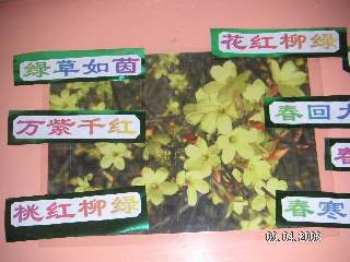 春天是万物苏醒的季节,孩子们通过观察发现了春天的脚步正一步一步的走进了自己的生活,在主题活动“春天在哪里”中,孩子们将自己观察到的用自己的画笔画出来,孩子们用自己学到的新成语来描绘自己看到的春天,有的孩子说:“我看到了春意盎然的春天”,“万紫千红的花朵开的真是艳丽啊!”孩子们的话语说的是如此好,于是在小组化的活动中我们创设了“春天的成语”大家说,孩子们在爸爸妈妈的共同协助下收集了许多美丽的春天词语,并在活动中说着孩子们玩的很投入。在我班的气象角中也新增加了一个“春天的脚步”,孩子们在每天的新闻报道中,都会把每天的天气、温度进行预报,以前的气象角中孩子们只是单一的记录天气的变化,而这几天忽冷忽热的气温引起了孩子们的注意,如何通过气温的记录让孩子们了解春天的变化哪,我们通过一张统计表的记录,孩子们发现了春天春暖乍寒的气温特点,一张小小的表格是每天孩子们关注的焦点,值日生每天都会及时向大家进行预报,并会向大家进行一个友情提醒,通过这个表格,我班生病的孩子也明显比以前少了许多。 班中的环境创设,老师即要考虑到孩子的知识需要,也同时需考虑到孩子多方面的发展需要,我班在春天环境创设中的点滴做法,我想能满足每个孩子多方面的需求的,愿每个孩子在这个春天的环境中收获更多。 | |